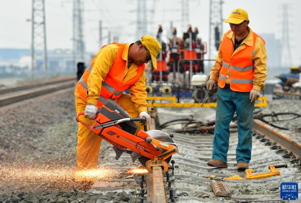 10月14日,工人在施工现场切割铁轨。