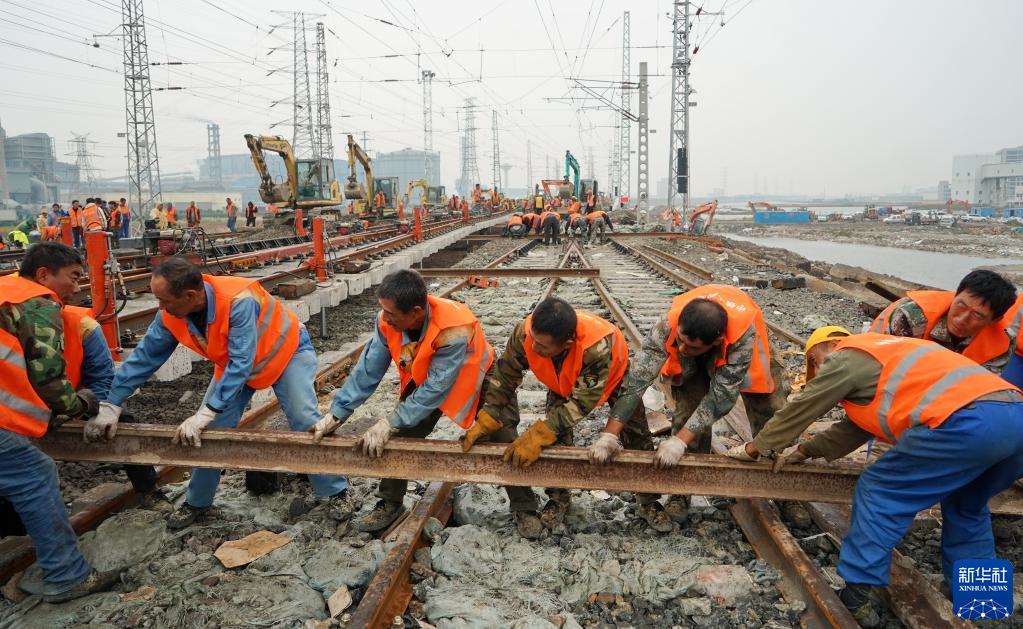 当日,经过中铁十四局集团1600余名建设者十多个小时连续奋战,邯黄铁路扩能改造工程渤海新区站19组道岔完成改造。