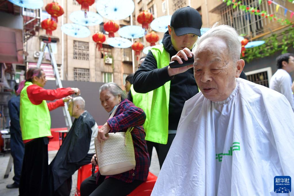在南昌市东湖区火神庙社区,“时间银行”志愿者在为社区的老年人免费剪头发(10月12日摄)。