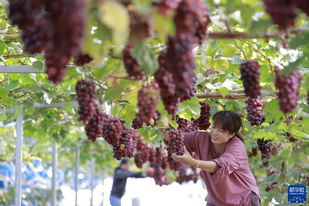 10月14日,河北省唐山市丰南区大齐镇夏庄屯村的农民在果园里采摘葡萄。
