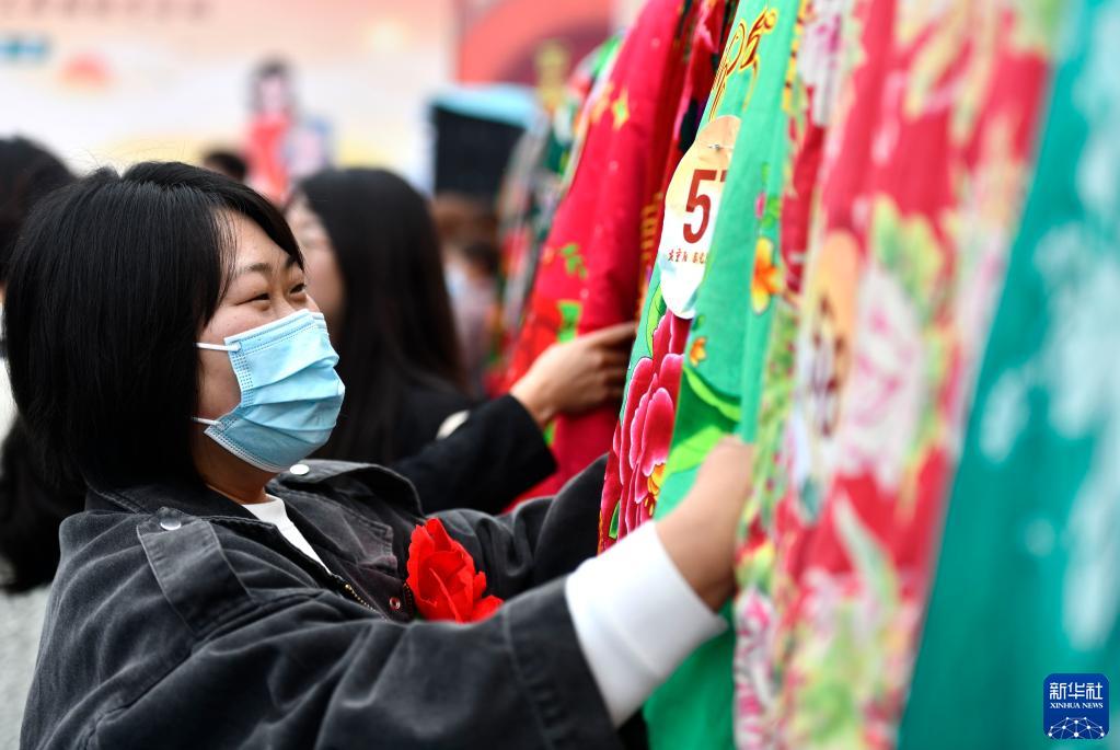 10月14日,天津市蓟州区罗庄子镇杨家峪村村民在重阳节“晒被子”活动中整理被子。