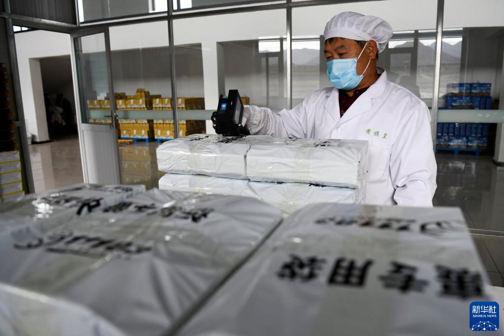 10月14日,在丰宁县一家小米加工企业,工人在为网销小米打码。