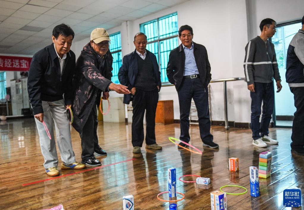 10月14日,老人在六盘水市钟山区老年大学参加趣味游戏。