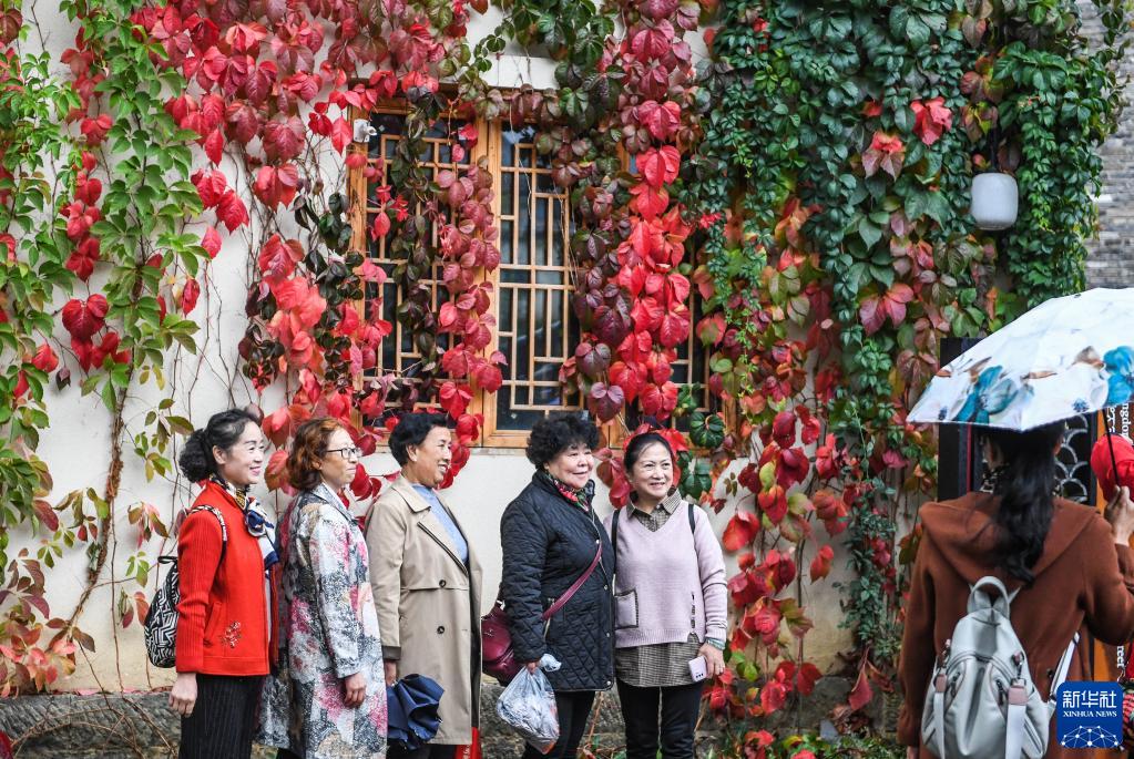 10月14日,老人在六盘水市钟山区一处景点合影留念。