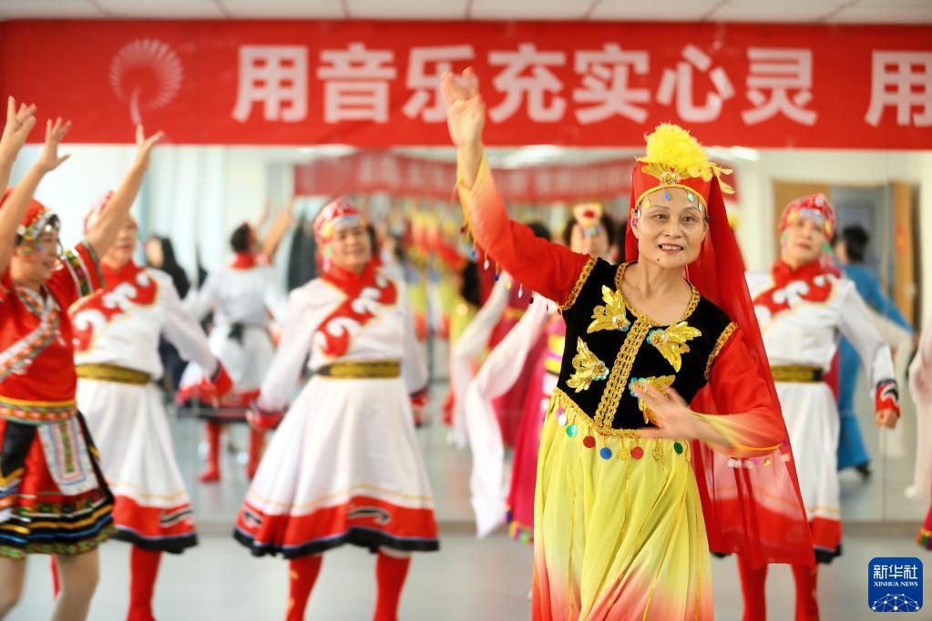 10月14日,居民在青岛市即墨区潮海街道古城社区新时代文明实践站里学习民族舞蹈。