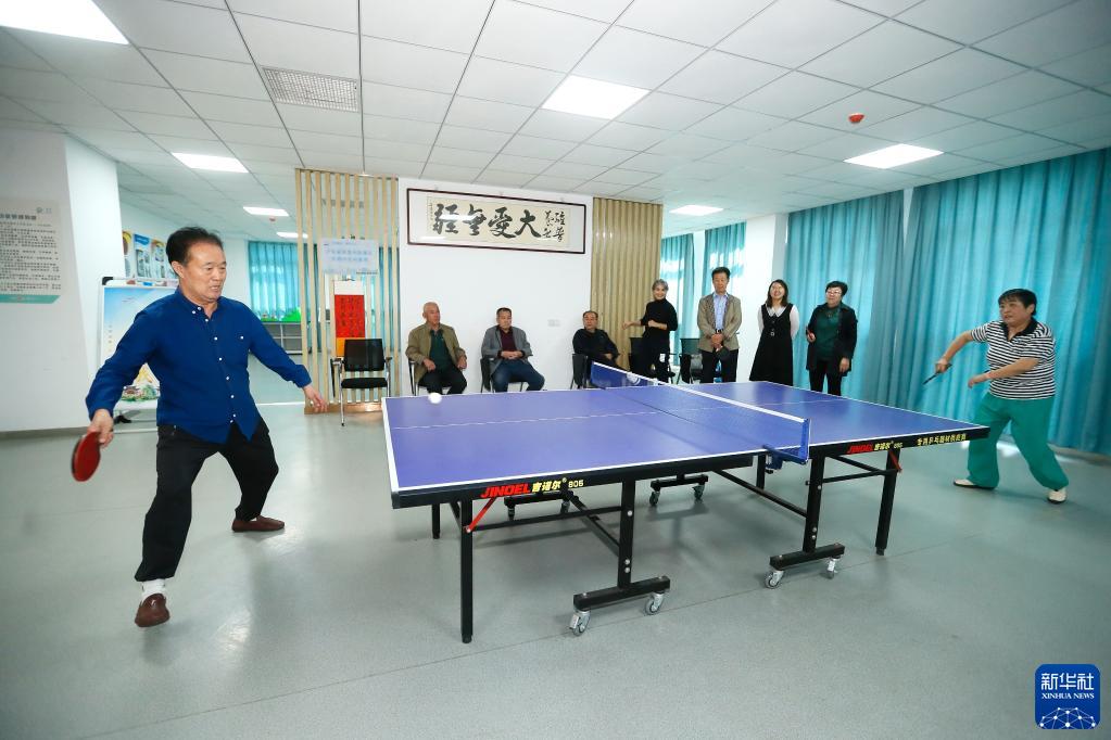 10月14日,居民在青岛市即墨区潮海街道古城社区新时代文明实践站里进行乒乓球比赛。