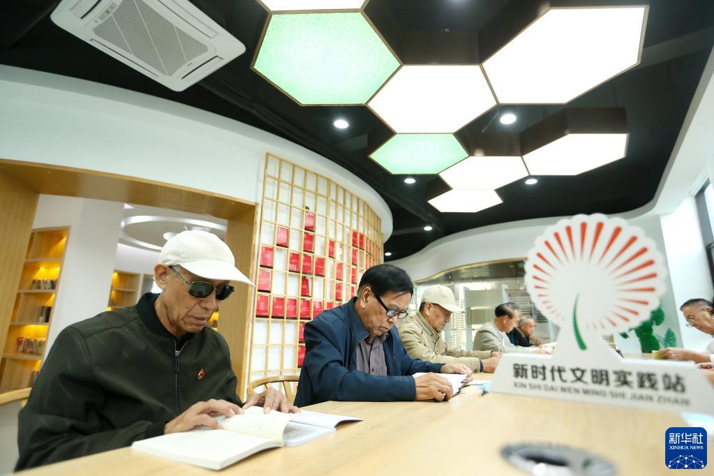 10月14日,居民在青岛市即墨区潮海街道古城社区新时代文明实践站里阅读。