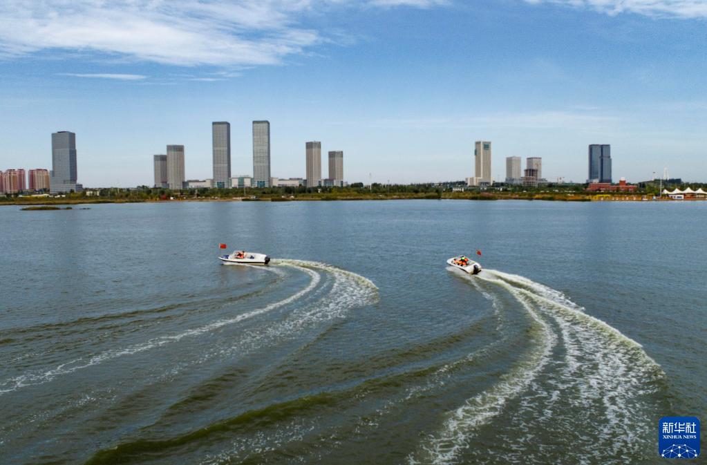 10月14日,游人在伊金霍洛旗东红海子乘快艇游览(无人机照片)。