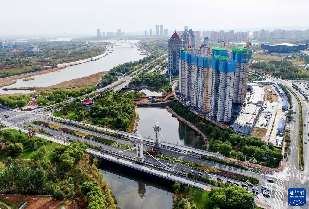 10月14日拍摄的伊金霍洛旗环城水系景色(无人机照片)。