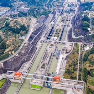 船舶有序通过三峡五级船闸(10月13日摄,无人机照片)。