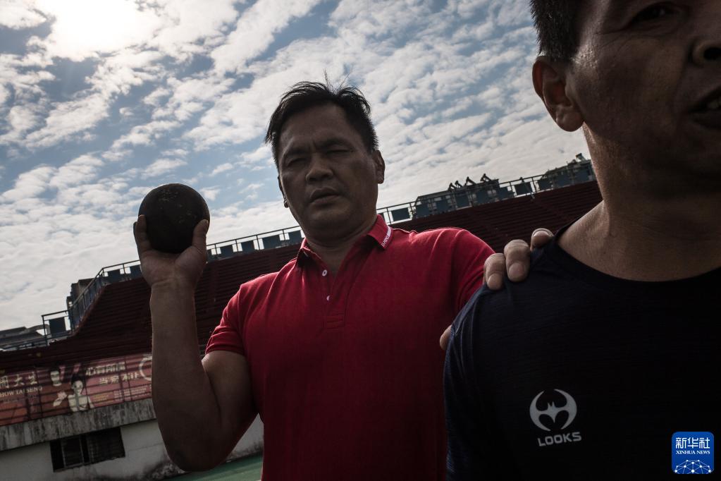 队友崔华引导田龙兵(左)进入铅球训练场地(10月12日摄)。新华社记者 肖艺九 摄