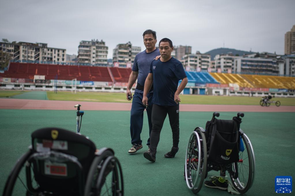 训练结束后,队友崔华将田龙兵(左)送回宿舍(10月11日摄)。新华社记者 肖艺九 摄