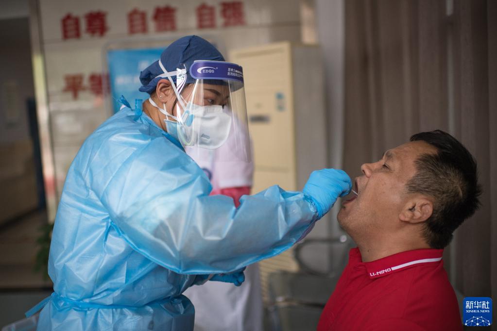 田龙兵(右)接受核酸检测,为全国第十一届残运会做准备(10月12日摄)。新华社记者 肖艺九 摄