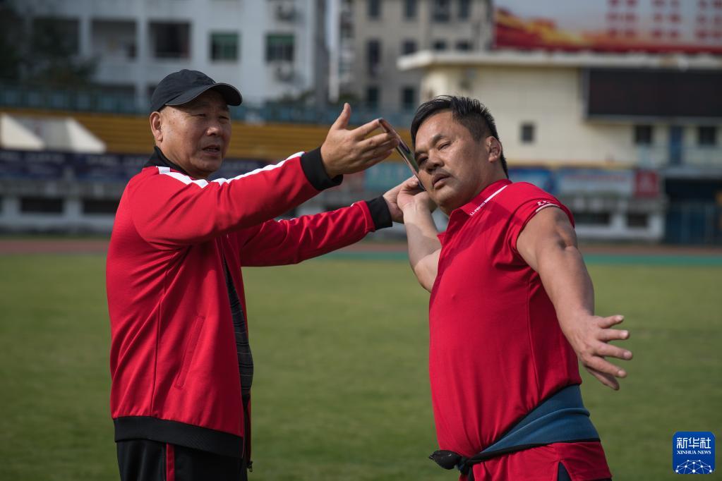 教练唐志刚指导田龙兵(右)进行标枪项目训练(10月12日摄)。新华社记者 肖艺九 摄