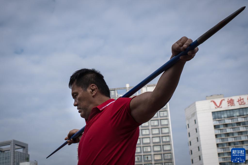 田龙兵在标枪项目训练前进行热身(10月12日摄)。新华社记者 肖艺九 摄