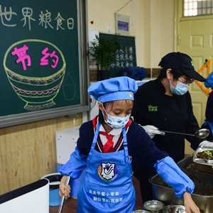10月15日,在合肥市翡翠学校三年级七班,孩子们在午餐中适量取餐。新华社记者 杜宇 摄