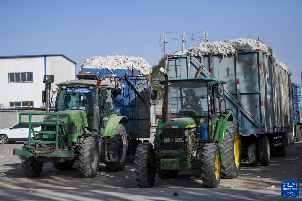 在尉犁县众望纺织有限公司,当地棉农驾驶着装满新棉的拖拉机准备交售棉花(10月14日摄)。新华社记者 赵戈 摄