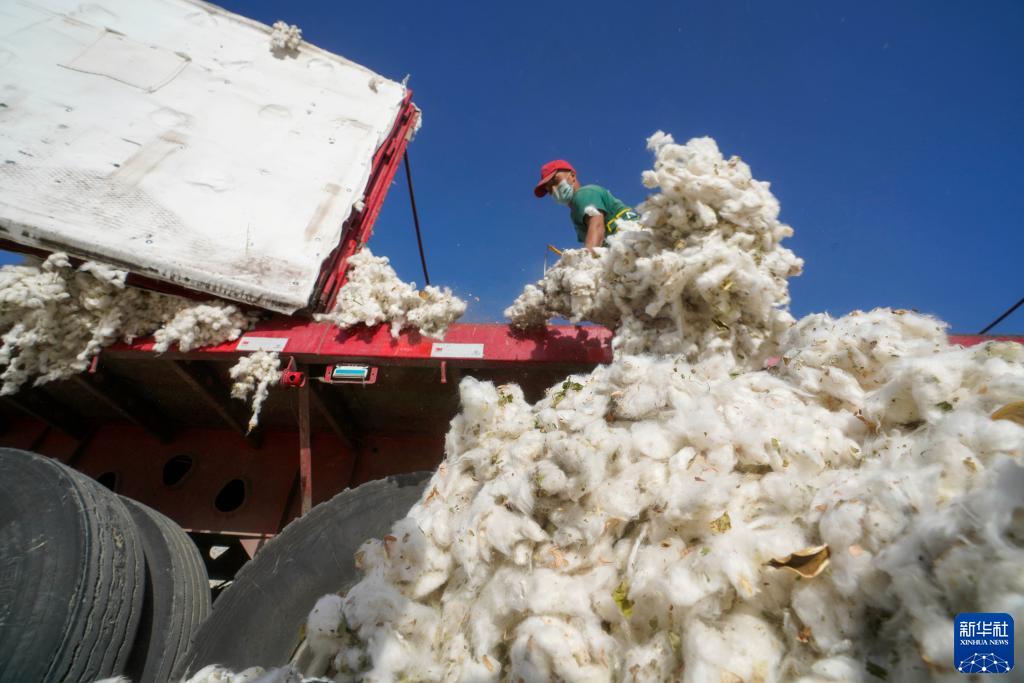在尉犁县众望纺织有限公司,工作人员将新棉从货车上卸下(10月14日摄)。新华社记者 赵戈 摄