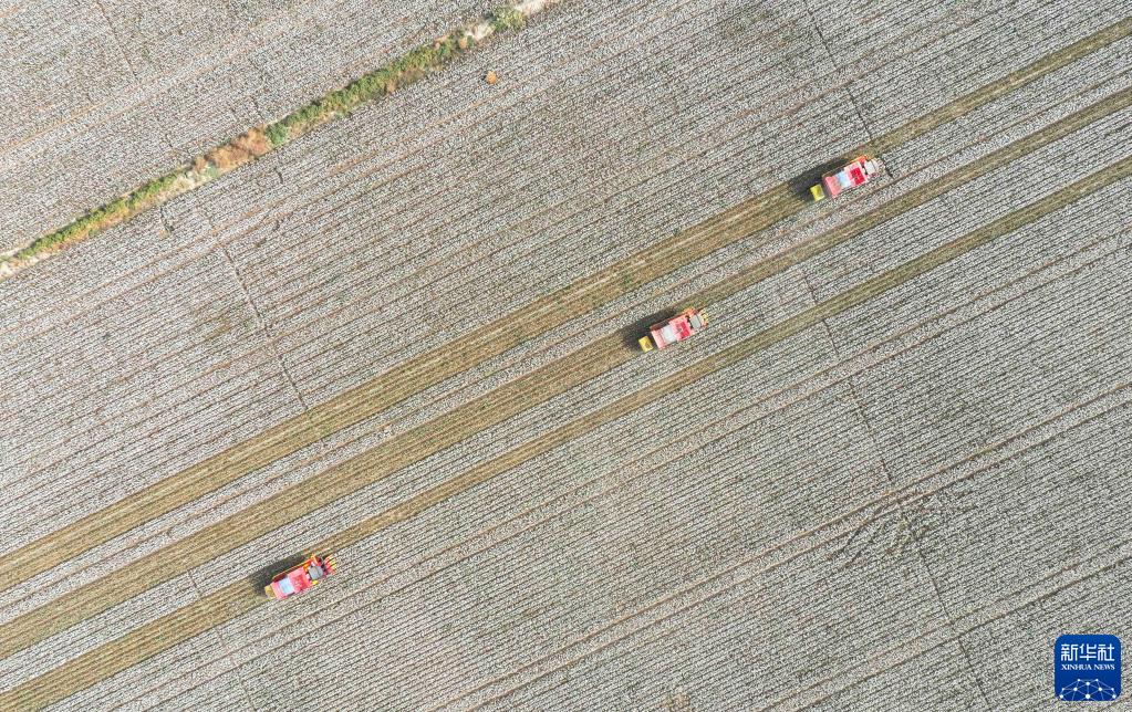 在尉犁县古勒巴格乡,采棉机在一处棉田里采收新棉(无人机照片,10月12日摄)。新华社记者 赵戈 摄