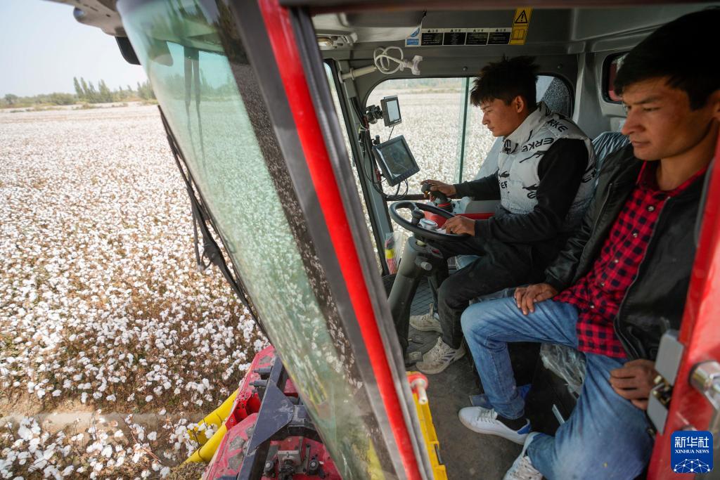 在尉犁县古勒巴格乡,采棉机驾驶员木热地里·吾斯曼(左)和表哥塞米·玉素甫在棉田里操作国产采棉机(10月12日摄)。新华社记者 赵戈 摄
