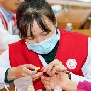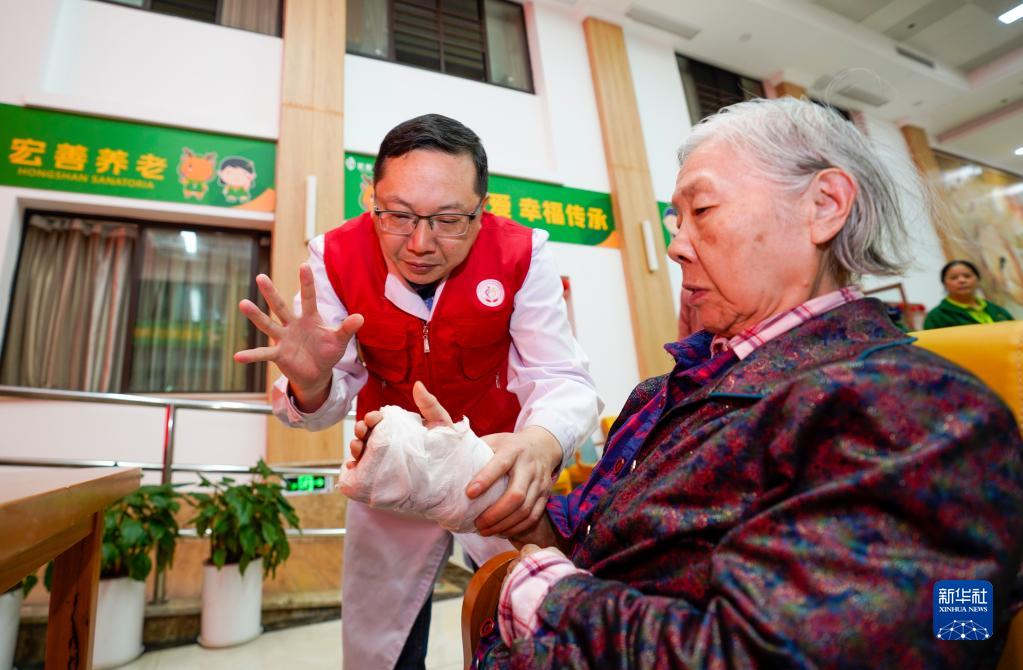 10月15日,在重庆九龙坡区宏善公园里怡养中心,“三心”劳模志愿服务队“匠心”分队队员杨友刚(左)为一名右手摔伤的老人进行检查。