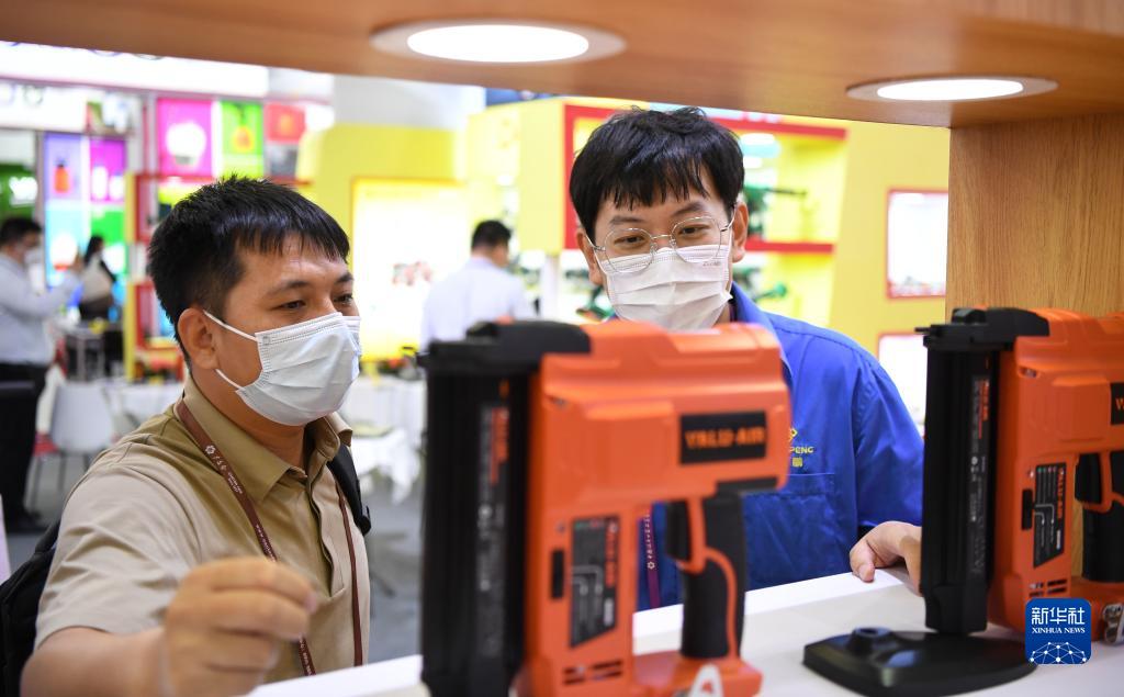 10月15日,在第130届广交会上,一名境内采购商(左)与气动工具参展商洽谈。新华社记者 邓华 摄