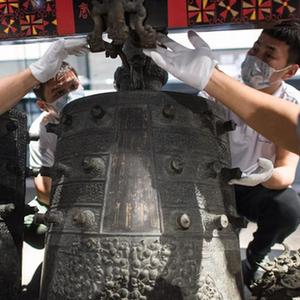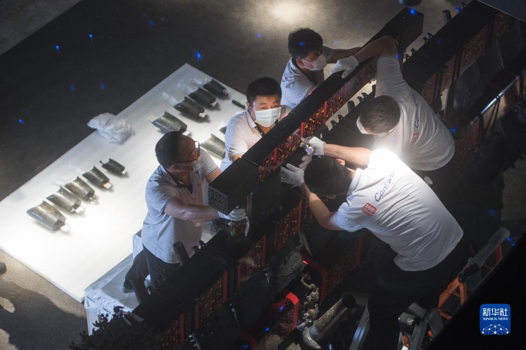 10月15日,工作人员对曾侯乙编钟进行调试安装。