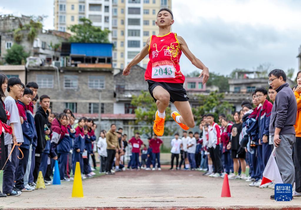 10月15日,贵州省黔西一中学生在进行男子跳远比赛。