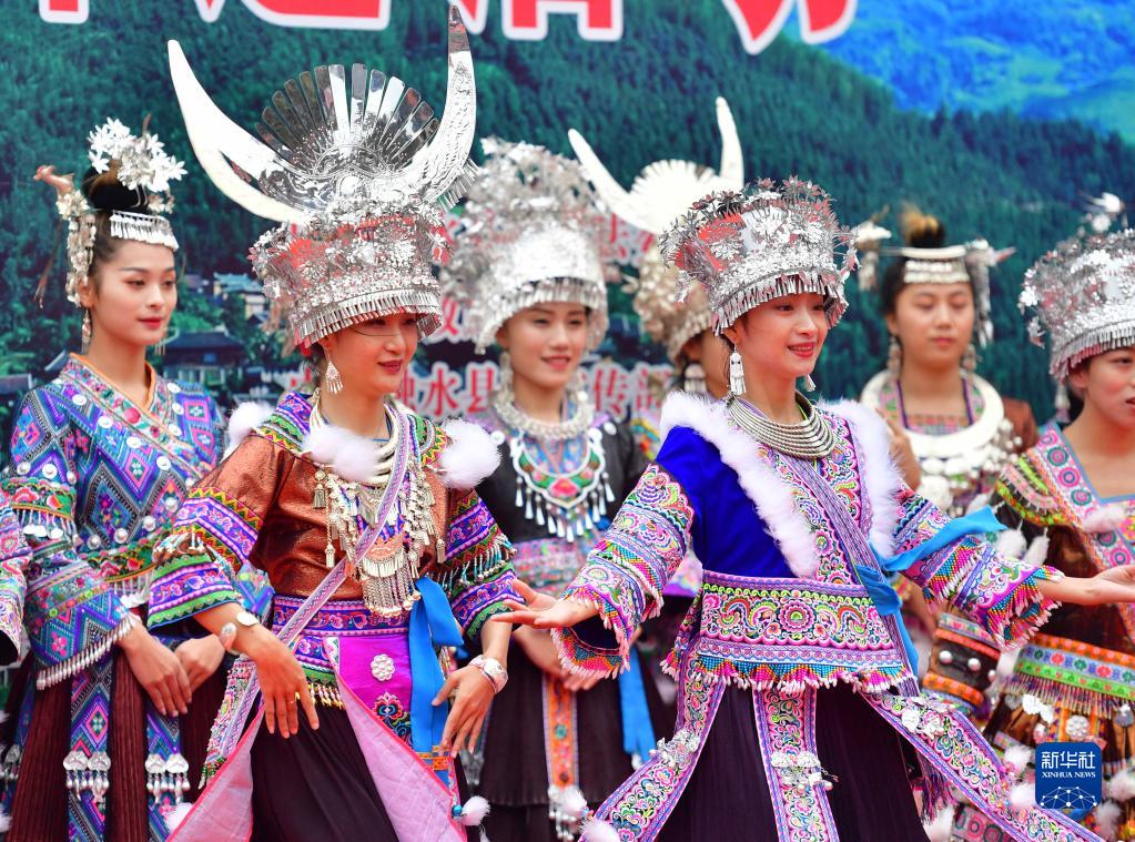 10月15日,在广西融水苗族自治县四荣乡庆丰收活动中,苗族姑娘在展示才艺。