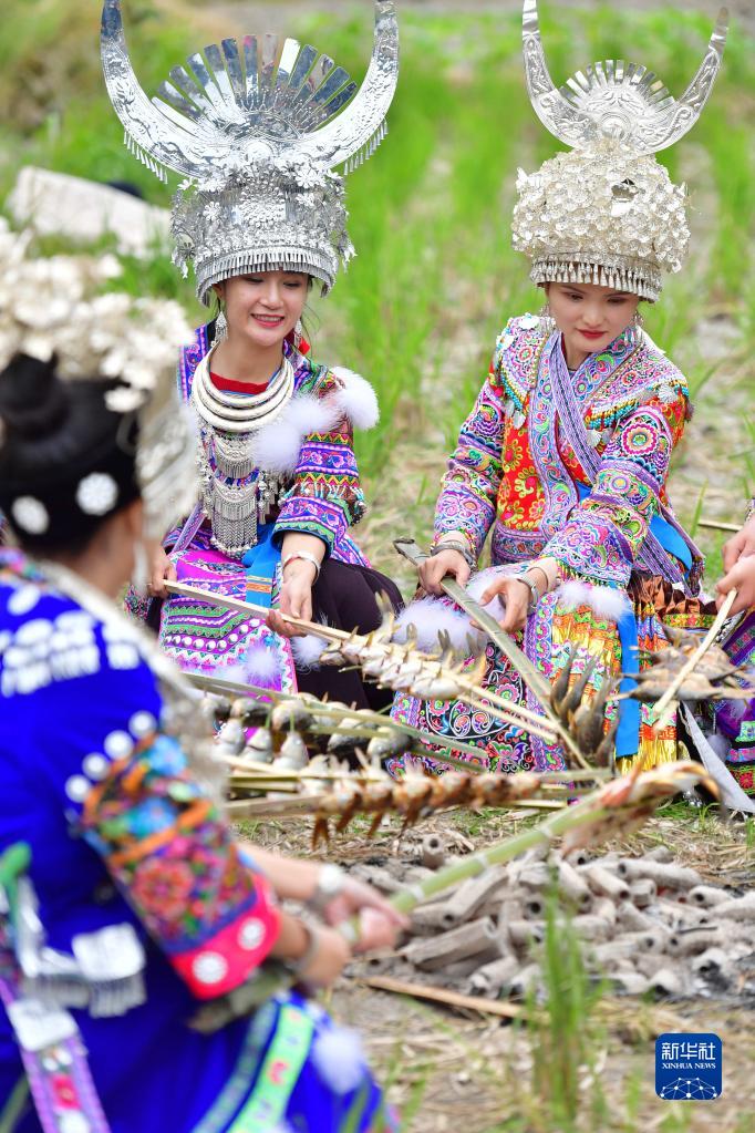 10月15日,在广西融水苗族自治县四荣乡庆丰收活动中,苗族姑娘在田间烧鱼。