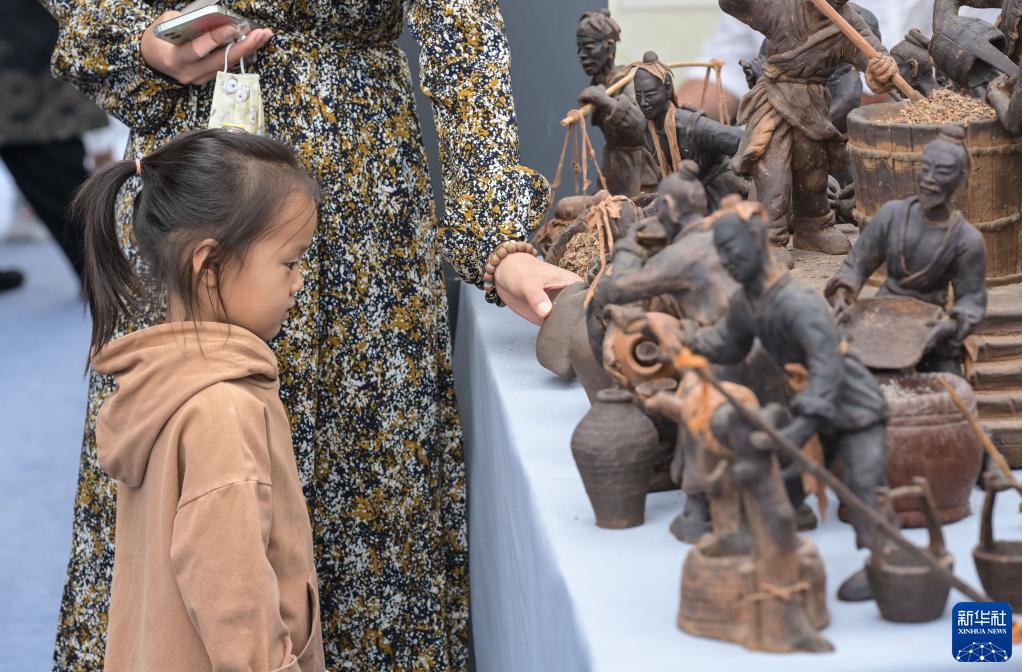 10月15日,一名小女孩在第五届中国非物质文化遗产传统技艺大展上观看淮北泥塑。新华社记者 韩旭 摄