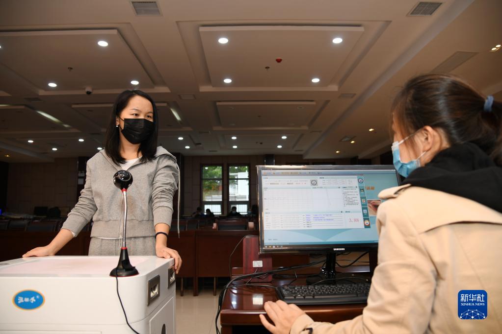 10月15日,在全国盲人医疗按摩人员考试培训班上,视力障碍学员代婷学习使用智能推拿手法测定仪进行测试。