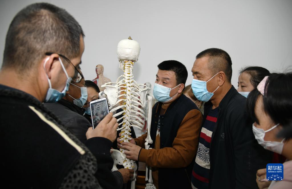 10月15日,在陕西省城市经济学校中医保健按摩培训班上,教师魏鑫(中)指导视力障碍学员了解人体骨骼构造。