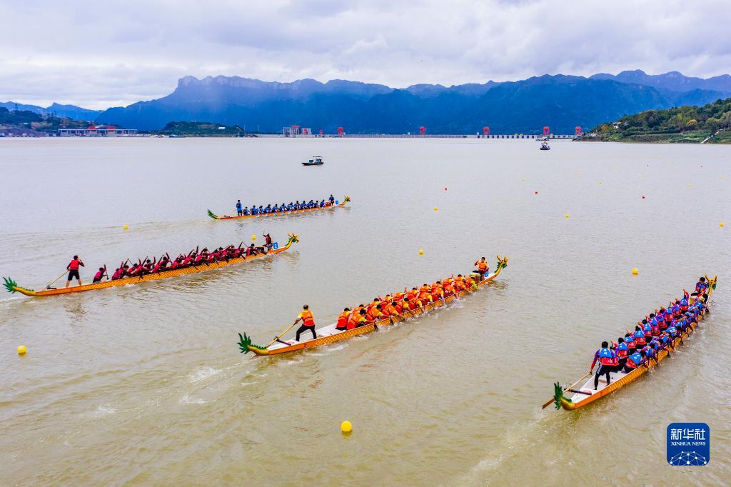 10月15日,参赛选手在参加传统竞技龙舟比赛(无人机照片)。