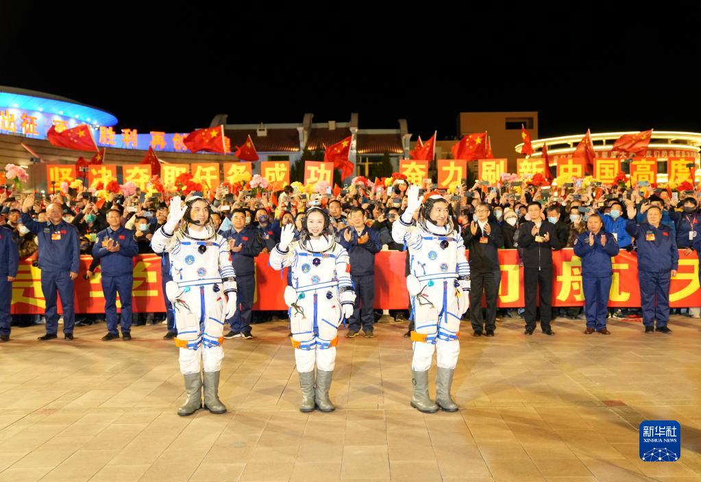 10月15日晚,神舟十三号载人飞行任务航天员乘组出征仪式,在酒泉卫星发射中心问天阁广场举行。翟志刚(右)、王亚平(中)和叶光富即将开启为期6个月的飞行任务。