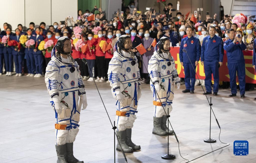 10月15日晚,神舟十三号载人飞行任务航天员乘组出征仪式,在酒泉卫星发射中心问天阁广场举行。翟志刚(中)、王亚平(右)和叶光富即将开启为期6个月的飞行任务。