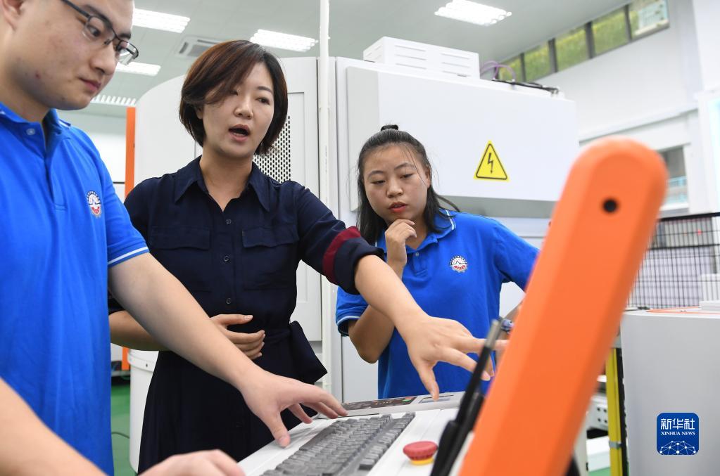 10月14日,在深圳职业技术学院,唐雪梅(右)在课堂上学习智能制造相关内容。 新华社记者 毛思倩 摄