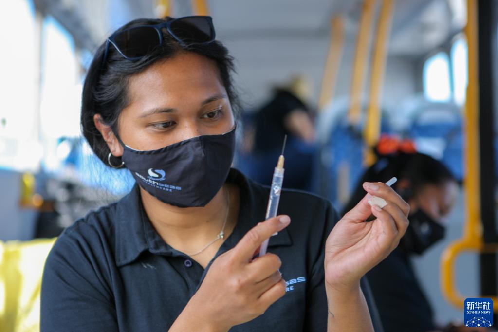 10月16日,在新西兰奥克兰,医务人员在巴士改造的疫苗接种点做准备工作。