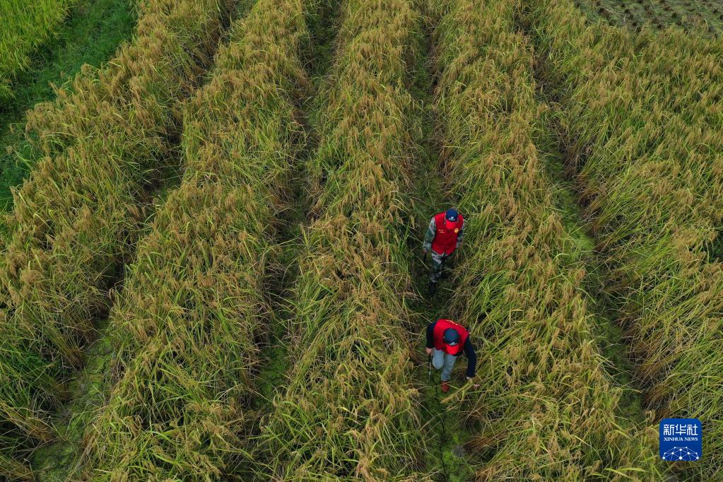 10月16日,党员志愿者在三都镇新和村袁隆平生态水稻种植基地收割“巨型稻”(无人机照片)。