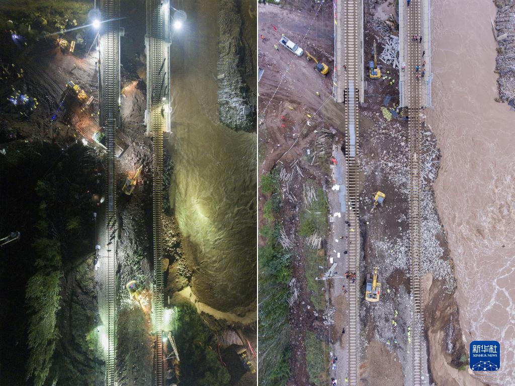 拼版照片:左图为10月8日凌晨拍摄的南同蒲铁路昌源河大桥抢修现场(无人机照片);右图为10月8日上午拍摄的南同蒲铁路昌源河大桥抢修现场(无人机照片)。在现场,施工人员日夜不停进行抢险施工。