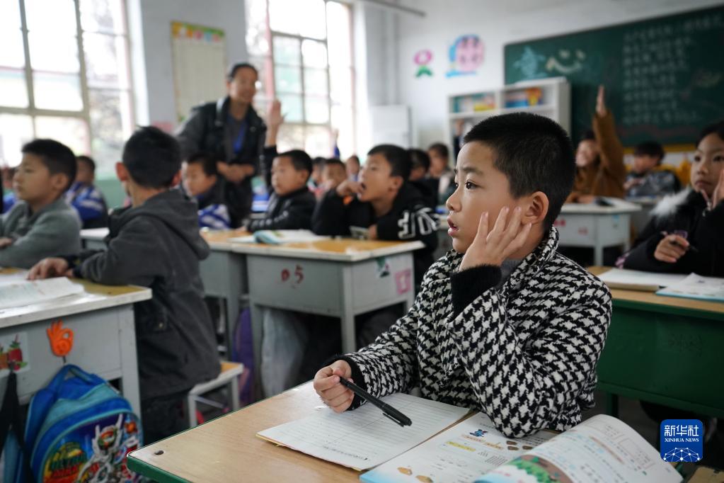 10月11日,在山西省稷山县清河镇吴璧小学安置点,荆平村的孩子在认真听课。