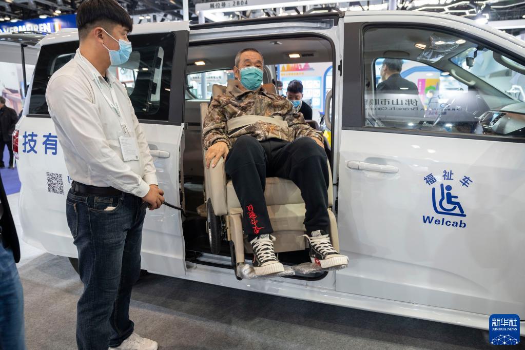 10月16日,在中国国际福祉博览会上,一名行动不便的老人试用一款福祉车。福祉车专门为行动不便人群设计,为坐轮椅的乘客提供了升降平台,部分座椅也可伸出车外,方便乘客上下车。