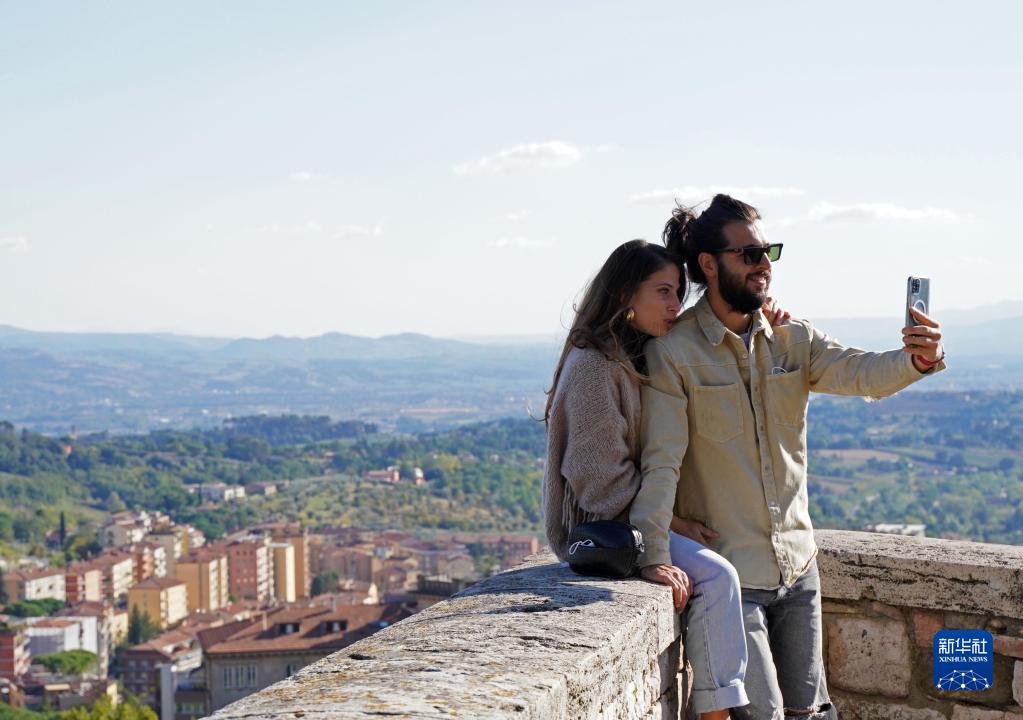 10月15日,一对情侣在意大利佩鲁贾的一处观景台自拍。