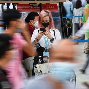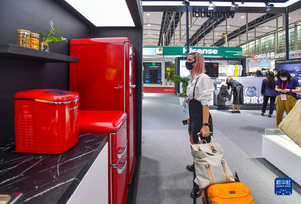 劳敏妮在广交会展馆观看中国企业设计的外观复古时尚的家电(10月15日摄)。
