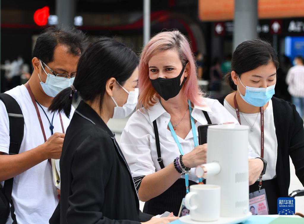 劳敏妮(右二)在广交会展馆一家小电器展台洽谈,她在这里了解市场趋势、交流设计理念、发展潜在客户(10月15日摄)。
