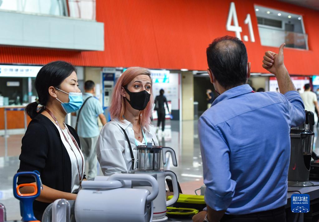 劳敏妮(中)在广交会展馆里碰到同在佛山做工业设计的土耳其设计师,两人在交谈(10月15日摄)。