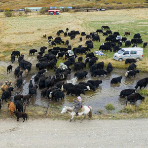 川西北的牧民在夏牧场放牧的时间较短,冬牧场上的时间较长,约占全年的三分之二,冬牧场也是当地牧民定居点。转场的距离近的有一二十公里,远的有上百公里,超过五十公里牧民就要用两天行走。
