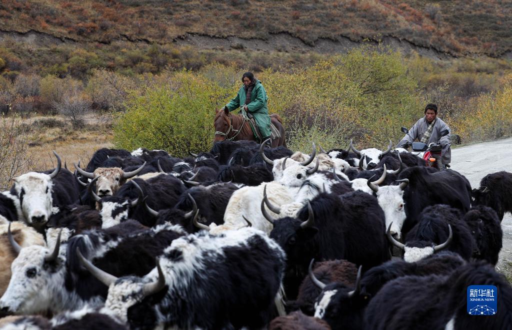 10月17日,四川省红原县阿木乡卡口村藏牧民罗让骑着摩托车,妻子骑着马,把牛羊赶回冬牧场。