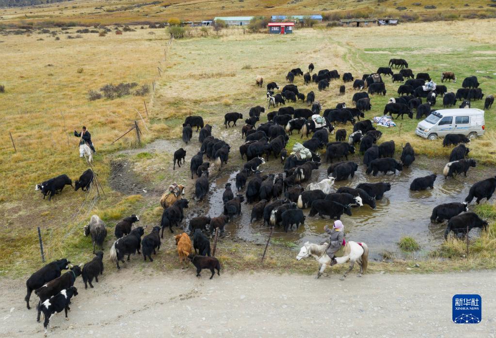 10月17日,经过两天爬涉,四川省红原县阿木乡卡口村藏牧民顿炯和向巴两家的牛羊回到冬牧场的草场上(无人机照片)。