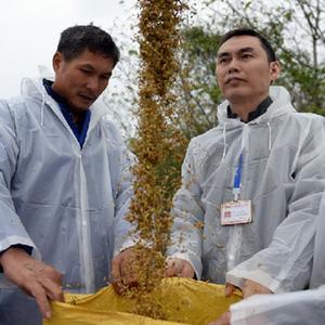 10月17日,测产组工作人员在测产现场将稻谷装袋。